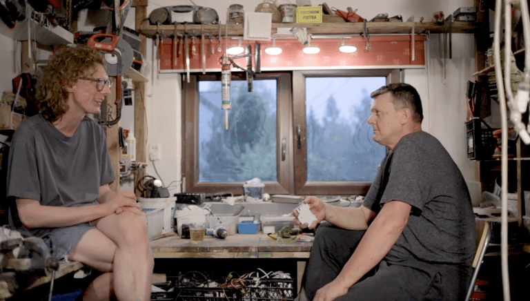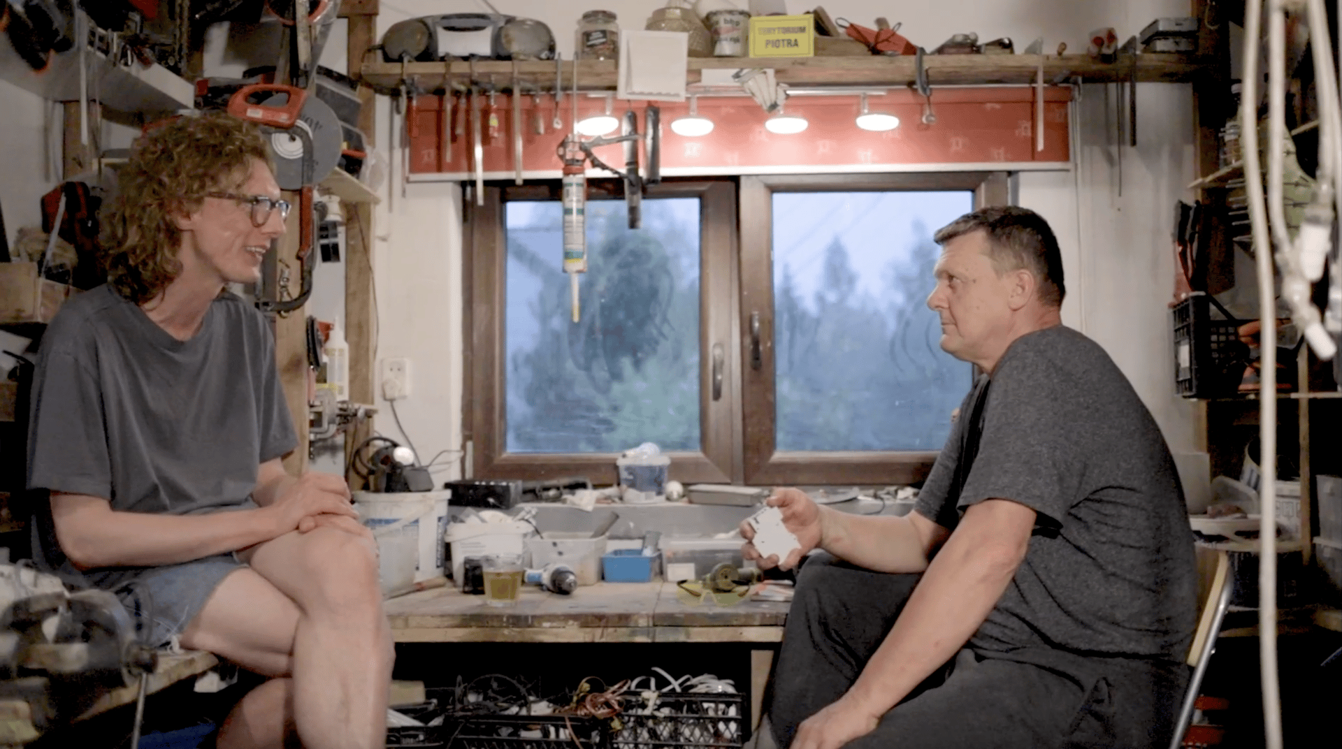 This work documents a dialogue between the artist and her conservative father, set in his metal workshop, where she frames his tinkering as a form of artistic practice. Through the format of an artist interview, she explores themes of working-class background, class consciousness, and their relationship to sexual emancipation. The film opens with the father performing physical tasks such as moving coal or laying bricks, later echoed by Filipka, who “queers” these gestures by repeating them in a dress. Filmed in the very space her father was building, the work symbolically reflects their shared act of construction despite ideological differences. It was presented in We Want the Whole Life. Feminisms in Polish Art at the State Gallery of Art in Sopot—the largest survey of feminist art in Poland’s history.
